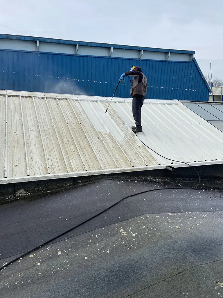 Nettoyage et démoussage de toiture pour éliminer mousse, algues et salissures.